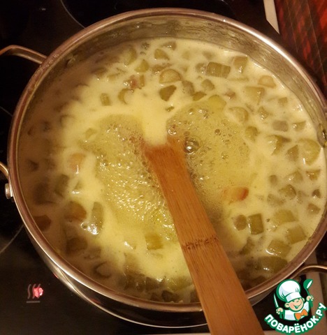 Ставим на плиту, вливаем воду и варим около 10 минут, пока что без сахара. Постоянно помешиваем. Ревень должен весь изменить цвет от нагрева. И вместо ярко-зеленого стать оливковым