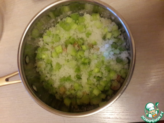 Складываем ревень в емкость, в которой вы будете варить варенье, засыпаем сахаром, накрываем крышкой и оставляем на 5-6 часов, чтобы он пустил сок
