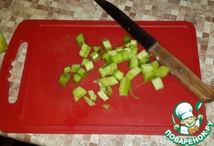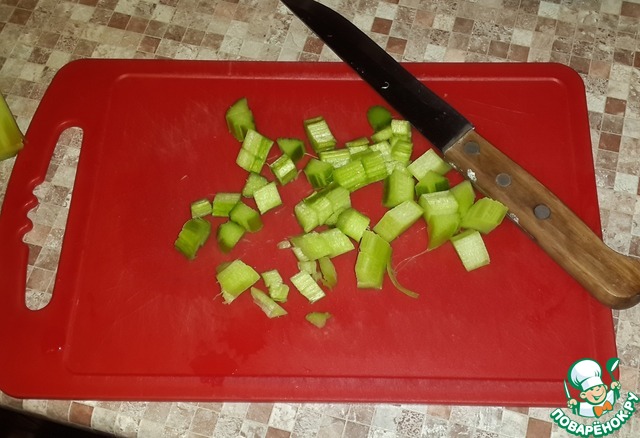 Теперь ревень нужно нарезать на кусочки. Длина кусочков - на ваш вкус. Я нарезаю по 1 см