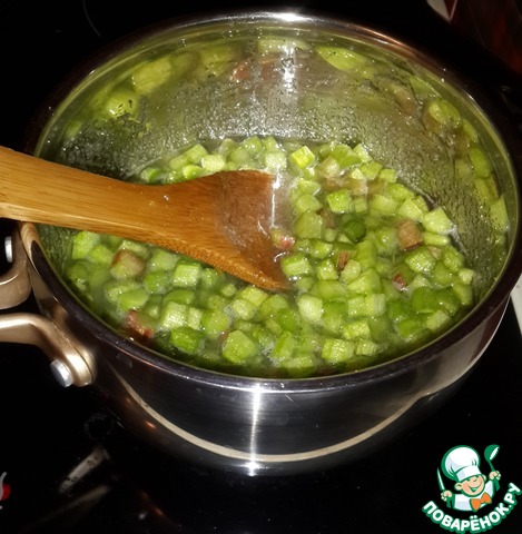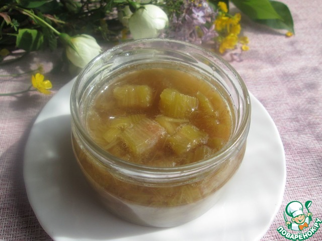 Отличие варенья от джема в том, что при таком способе приготовления плотные кусочки ревеня равномерно распределены в густом прозрачном сиропе.