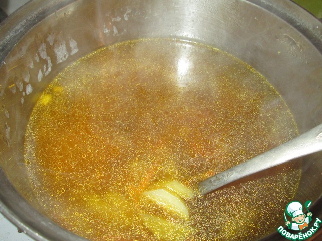 Грибы нарежьте ломтиками и варите в 1,2 л воды, снимая пену, около 30 мин. Бульон процедите.