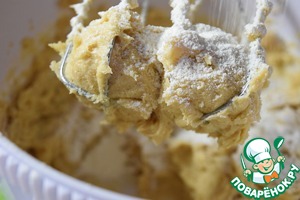 Муку просеять с разрыхлителем и ввести в тесто, перемешать.