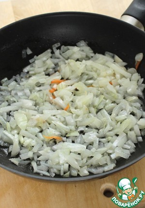 Разогрейте растительное масло и пропассеруйте лук до прозрачности. Затем добавьте нарезанную морковь, обжарьте 5 мин.