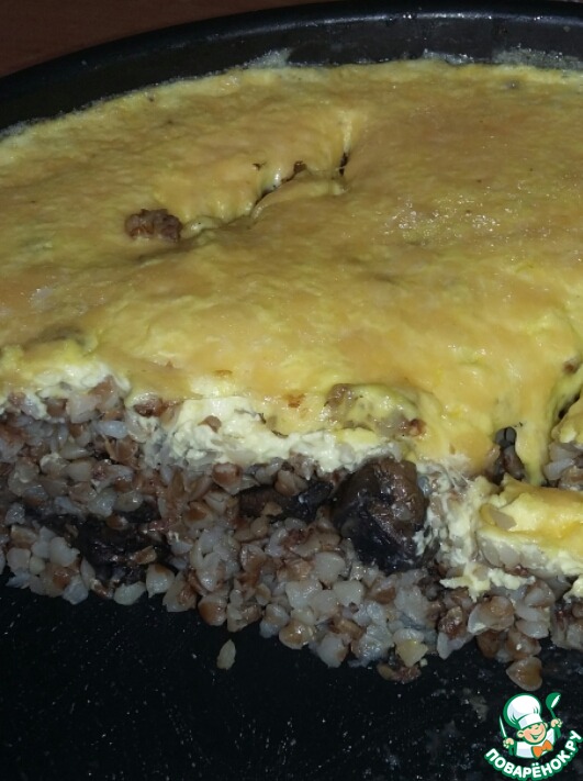 Выложить в смазанную форму (у меня диаметр 23 см) или противень половину гречки, затем слой грибов и накрыть оставшейся кашей.