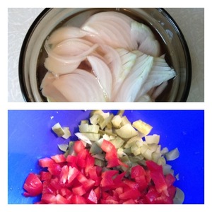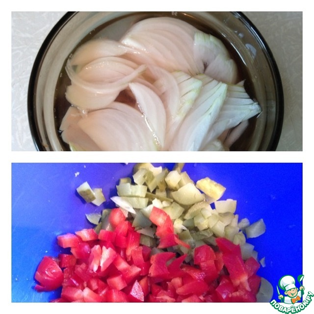 В пиалу налить воду, добавить сахар и уксус. Замариновать репчатый лук нарезанный полу кольцами. Оставить минут на 15.