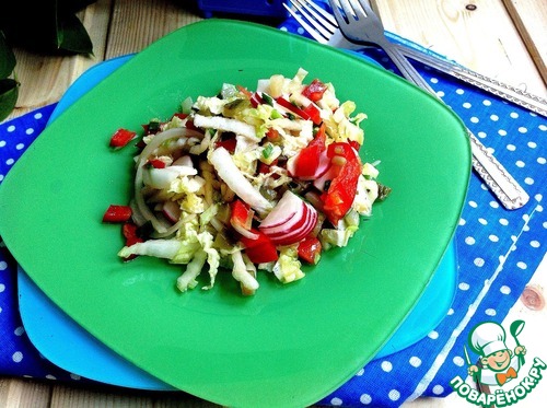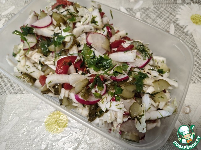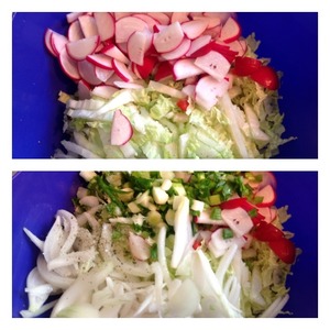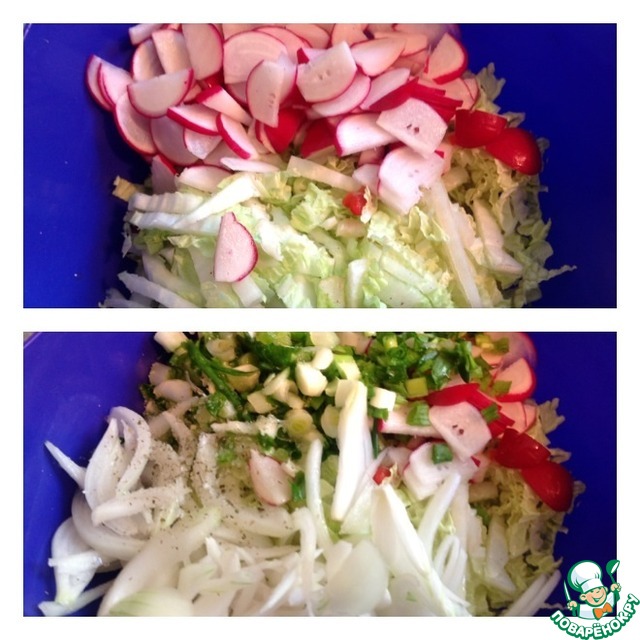 Капусту нашинковать. Редис разрезать пополам и нашинковать. Добавить соль, перец и масло. Зеленый лук мелко нашинковать и добавить так же замаринованный репчатый лук. Аккуратно перемешать.
