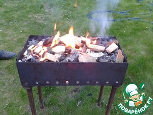 Сверху накидать щепок, они загорятся от углей. Готовить 30 минут.