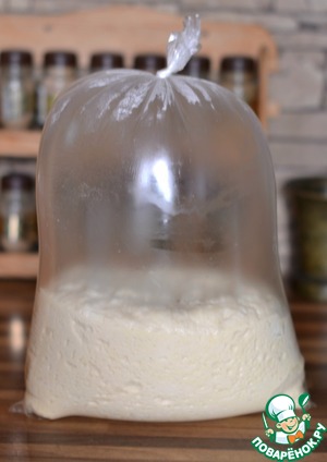 Дрожжи перетереть с солью, добавить теплую сыворотку и сахар, размешать. Масло сливочное распустить (в микроволновке), добавить к основной массе. Смешать. Влить смесь в хлебопечку. Добавить просеянную муку и включить режим "Тесто". Если делаете руками, то выполнять все в той же последовательности. Муку добавлять в несколько приемов. Сначала мешаем ложкой, потом руками. Тесто замешивается быстро - становится очень эластичным, мягким, но не тяжелым. Лучше потом, перед разделкой добавить еще муки. Вынуть тесто из чаши хлебопечки. Переложить в целофановый пакет и убрать в холодильник на 4 часа. Так выглядело тесто спустя сутки хранения в холодильнике.