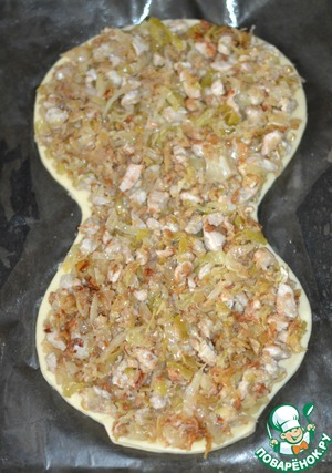 Выложить заготовку на противень, застеленный пекарской бумагой. Я смазала бумагу растительным маслом. Выложить начинку. Для начинки мелко порубить куриное филе, обжарить до слегка золотистого цвета на растительном масле. Добавить мелко пошинкованную молодую капусту. Посолить (по вкусу), поперчить (по вкусу), обжарить до готовности.