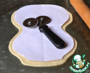 Раскатать 2 часть теста в овал. Приложить шаблон и вырезать, отступая от контура на 1,5-2 см.
