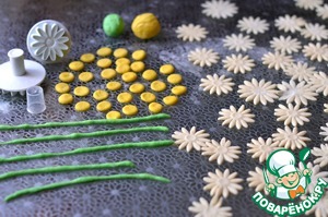 За 5 минут до готовности пирога сделаем украшения. Тесто раскатать тонко, с помощью плунжера вырезать ромашки. Отщипнуть от теста 2 небольших кусочка. Добавить в них пищевые красители - зеленый и желтый. Помять тесто в руках, чтобы красители распределились равномерно. Тесто становится похожим на эластичную воздушную массу, которую очень приятно держать в руках. Вырезать кружки подходящего размера под ромашки - это будет сердцевина цветка. Из зеленого теста скатать несколько стебельков.