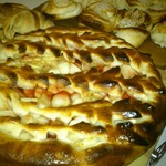 Накрыть получившейся заготовкой начинку. Края подвернуть не теряя формы. Смазать пирог смесью из яйца, 1 ч. л. сахара и 1 ст. л. воды. Выпекать без расстойки в заранее прогретой до 180 гр духовке до золотистого цвета.