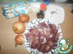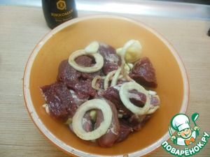 Подготовим наши ингредиенты. Мясо нарезать крупными кусочками, лук кольцами.