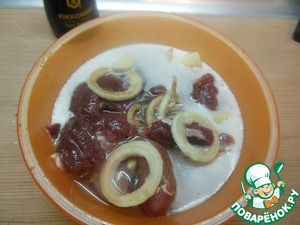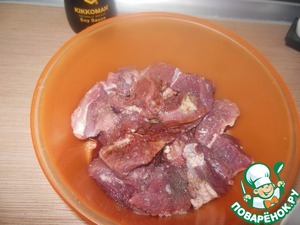 Мясо посолили, посыпали чёрным перцем, залили соевый соус. Всё хорошо перемешали, каждый кусочек промассажировали...