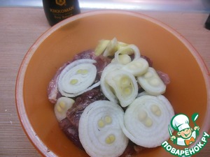 И с луком мясо пожмякаем... Он пустит свой сок.