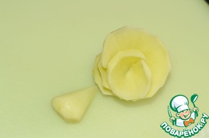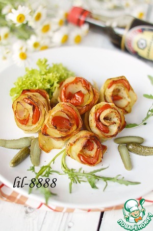 Помидор нарезать пластинками, выложить пластинки в розы. Здесь можно использовать бекон, или другие овощи. -