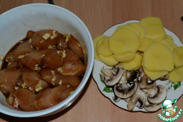 Картофель и грибы нарезать, пока маринуется грудка.