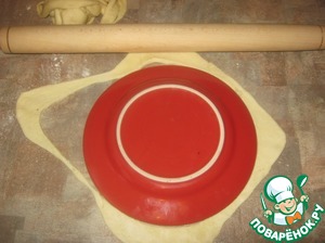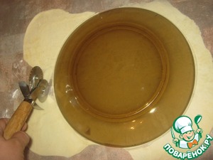 Раскатываем каждую часть теста и вырезаем из неё большой круг (по вашему усмотрению-28см у меня)