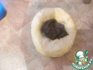 Делаем серединку-кусочек теста с кулак начиняем столовой ложкой начинки и защипываем делая колобок