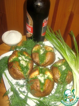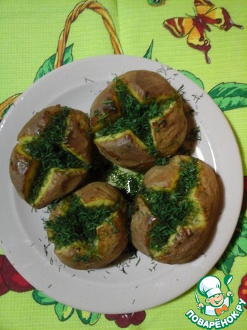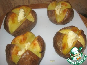 Достать из духовки картошку, горячей начинить смесью масла с чесноком