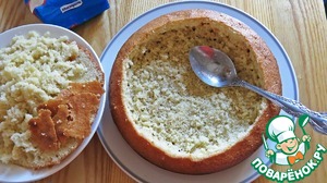 Теперь нам нужно сделать чашу из полностью остывшего (!) манника. Дно оставим около 1 см. Бортики на ваш вкус. Мои около 2 см. Срезаем макушку, при этом отделив корочку манника (её немного видно на тарелке слева), она пригодится нам для посыпки крошкой. А остальной мякиш легко достаем с помощью ложки. Стараясь сильно "не мельчить" кусочки.