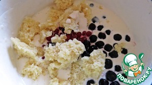 Добавляем в крем мякиш манника (ломаем кусочки размером с чайную ложку). Немного ягод оставляем для украшения сверху, а остальные высыпаем в крем. Всё тщательно перемешиваем.