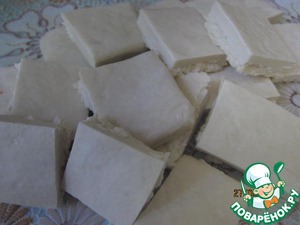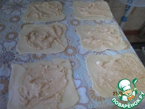 Разморозить тесто и нарезать на квадратики, у меня получилось 12 квадратиков