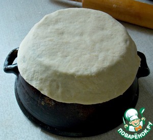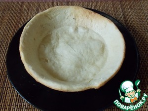 Тесто делим на 4 части, раскатываем в лепешку толщиной около 5 мм. и выкладываем на чашки.