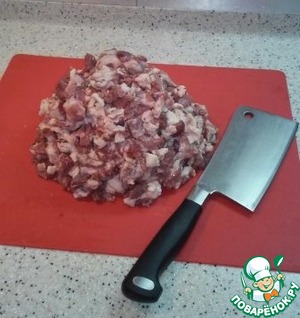 Смешать фарш и курдючное сало с мелко нарезанным луком, посолить, добавить черного перца, зиру и кориандр. Хорошо вымесить фарш, до полной однородности, и поставить его ненадолго в холодильник.
