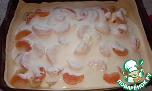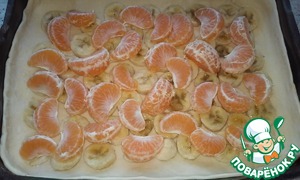 Раскатать половину слоеного теста. Выложить его в смазанную форму. Сверху выложить бананы и мандарины.
