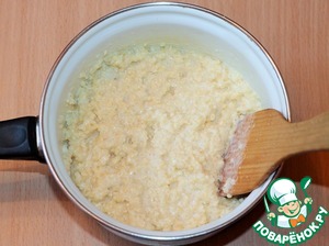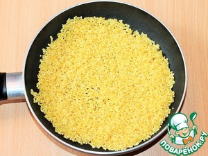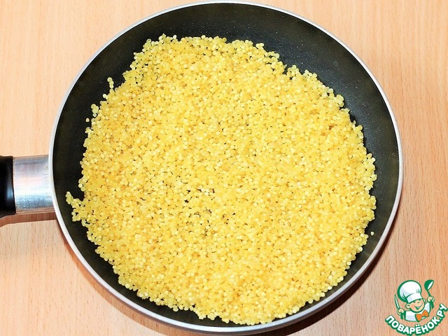 Одну столовую ложку сливочного масла разогреваем на сковороде, добавляем пшено и прожариваем его минут 5 до появления аромата и золотистого цвета.