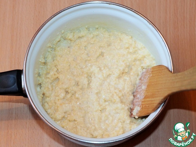 В кастрюльке доводим до кипения 2 стакана воды (или молока) и отправляем туда поджаренное пшено. Накрываем крышкой и на слабом огне готовим до готовности, не забывая перемешивать.