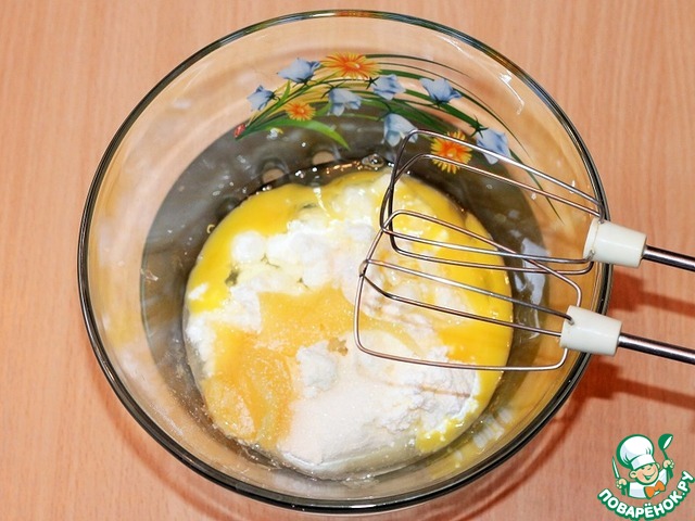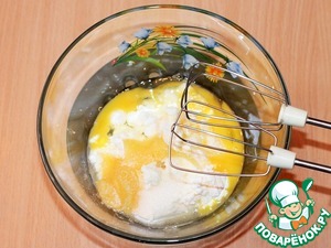 Смешиваем творог, яйца и мед. Можно немного подсластить, я добавила ложку сахара. Взбиваем смесь до однородного состояния.