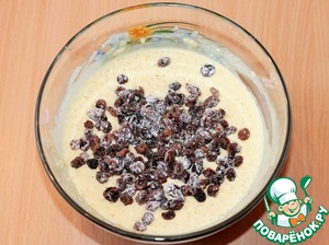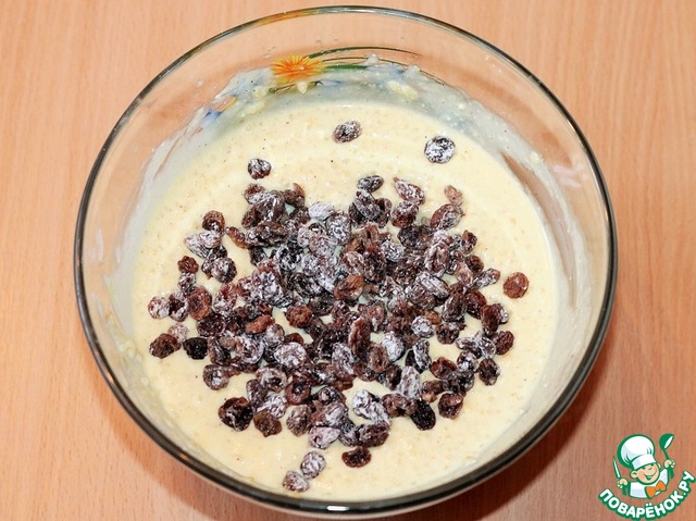изюм и соль. Еще раз все перемешиваем. Духовку разогреваем - до t 200 С.