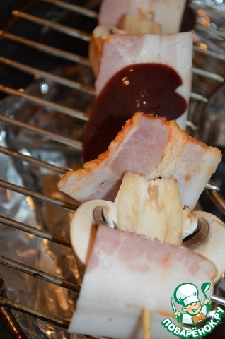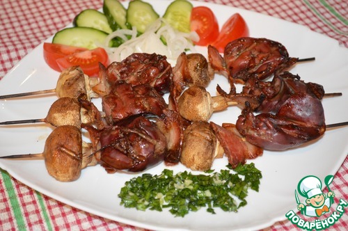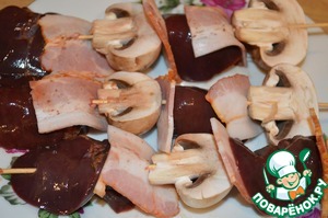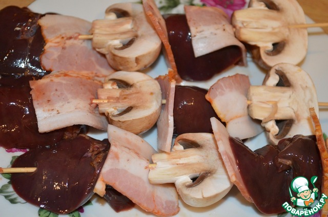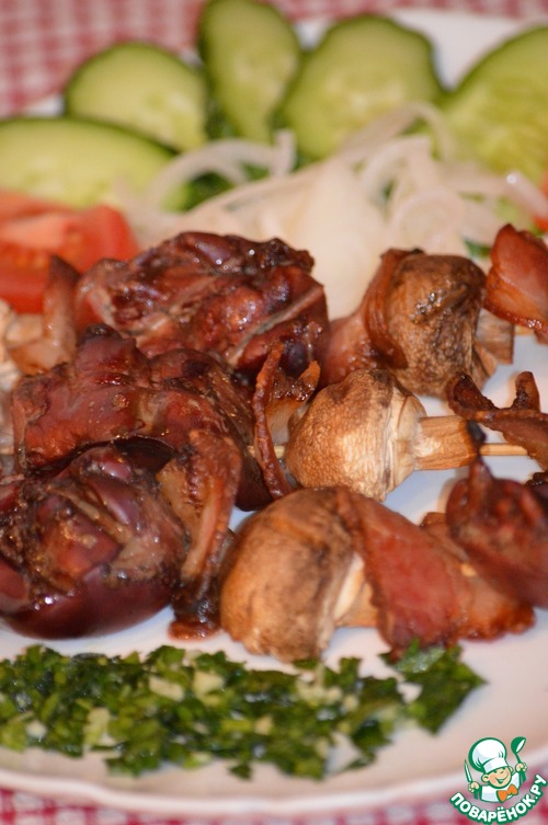 Рецепт «Шашлык из куриной печени с грибами и беконом»: