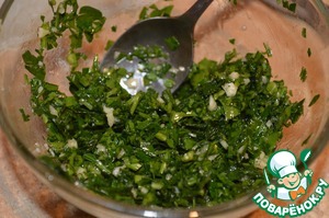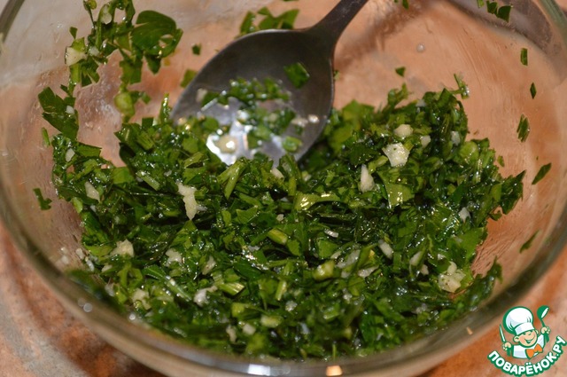 Петрушку и чеснок измельчить добавить соль, перец, оливковое масло и перемешать.
