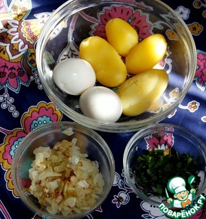 Для начинки используются готовые продукты: отваренный картофель в мундирах, яйца, заранее обжаренный лук и зелень петрушки - 2-3 ст. л.