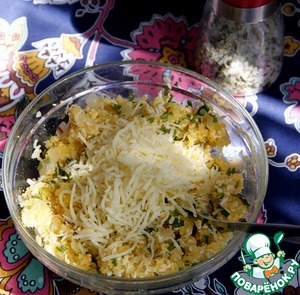 Натереть на крупной терке картофель, яйца, сыр, добавить рубленую зелень петрушки, обжаренный лук, приправить по вкусу.