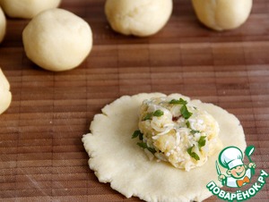 Расплющить шарик в кружок-основу, выложить сверху на половину теста 1-2 ч. л. начинки