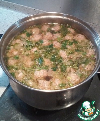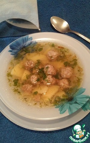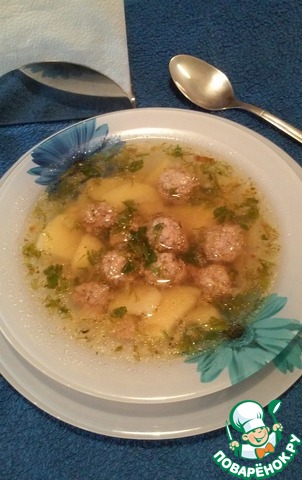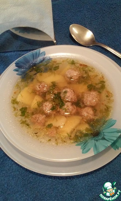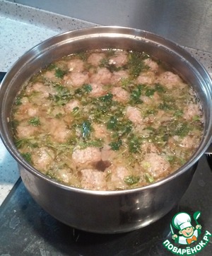 В кипящую воду помещаем картошку, варим до полуготовности. Далее закладываем в кастрюли фрикадельки. Даем прокипеть мину 5 и добавляем обжаренный лук. Солим и перчим по вкусу. Варим до готовности, за минуту до снятия с огня, добавляем зелень. Сразу предупрежу, фрикадельки варятся 10-12 минут до готовности.
