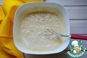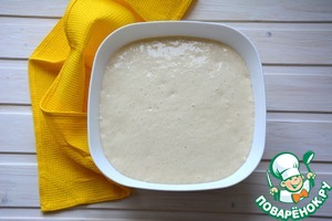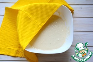 В 750 мл теплого молока растворить дрожжи. Молоко влить в сухую смесь, размешивая венчиком, чтобы не было комочков. Чашку накрыть полотенцем и убрать в теплое место (например, духовку) на 40 минут