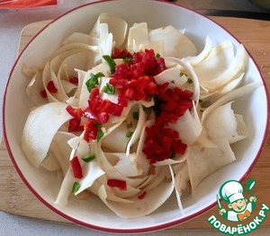 Сперва очистите корень и помойте. Возьмите нож для картофеля и нарежьте сельдерей тонкими кусочками. Аромат разольется потрясающий. Мелко нарежьте красный и зеленый перец. Все соедините.