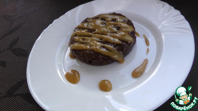 Перед подачей пирожное вынуть из холодильника, дать ему постоять 5 минут, затем аккуратно достать из формы (потянув за пленку). Выкладываем пирожное на тарелку, сверху поливаем карамелью.