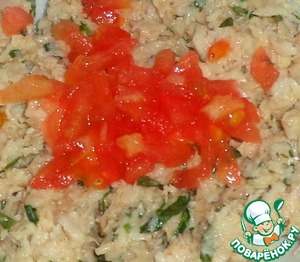 Рыбные тефтели с рисом и свежим помидором. Дополняет тефтели сырная начинка.