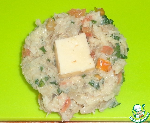 Из массы сделать лепешки и кладем в середину каждой кубик твердого сыра. Сыр можно положить так, либо натереть на терке и добавить в массу.