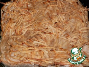 На луковую "подушку" выложить мяско и сверху выложить натeртые на крупной тeрке яблоки.