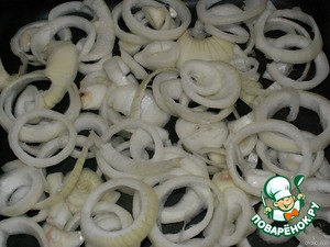Взять форму для запекания и застелить дно нарезанными кольцами лука (целостность колечек нужно сохранить).