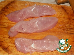 Мясо нарезать кусочками шириной 1 см., отбить молоточком.