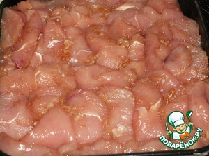 [+5]У меня филе бедра, ровные ломтики не получились, нарезала полосками и яблоко натёрла на мелкой тёрке, чтобы побольше сока отдали.