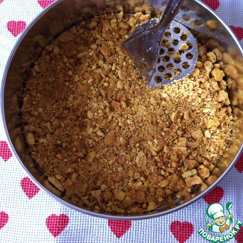 Печенье с маслом переложить в форму и утрамбовать. Форма у меня разъёмная, 24 см., форму ничем не смазываю.